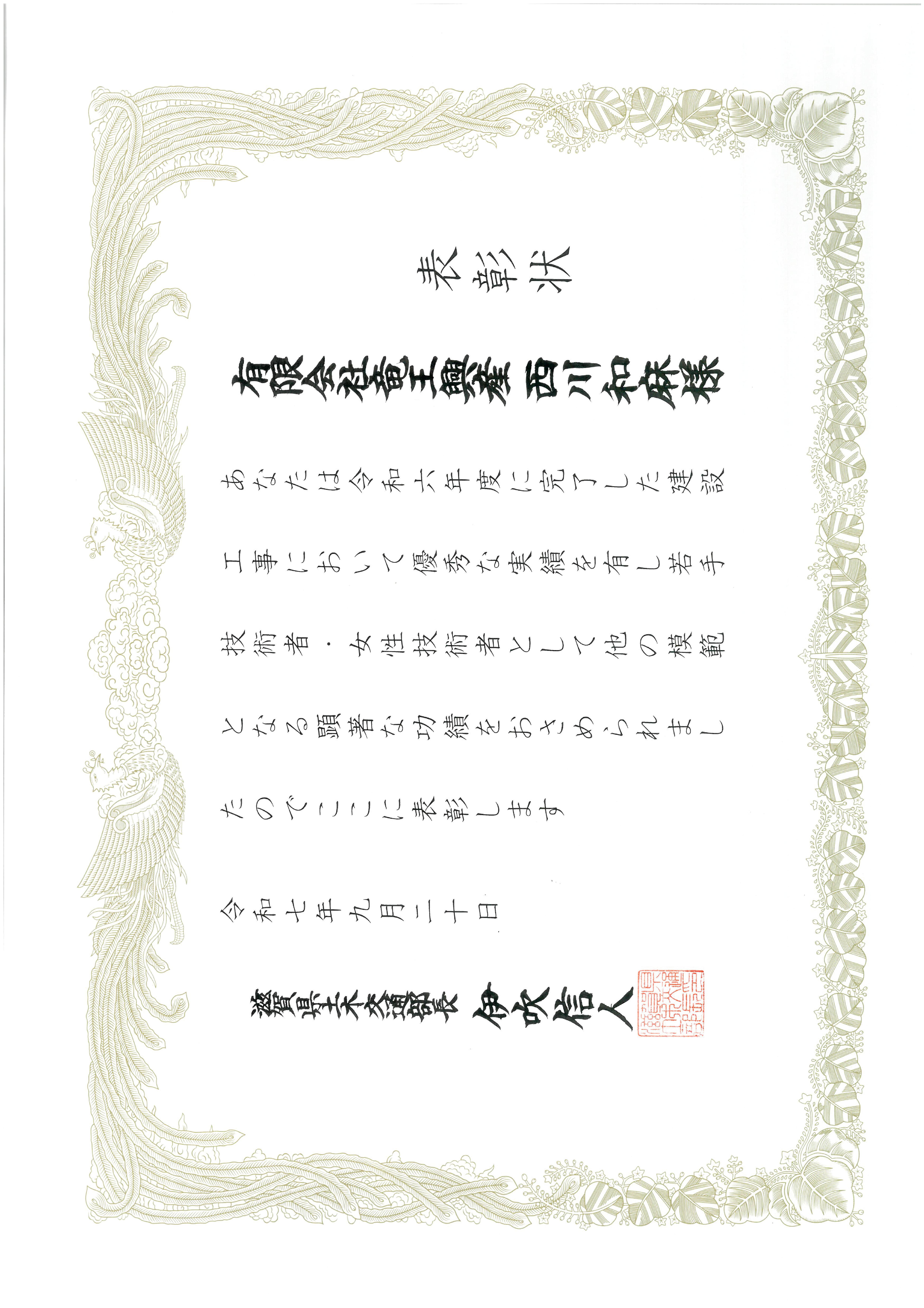 受賞!! 令和7年度 滋賀県若手技術者・女性技術者土木交通部長表彰